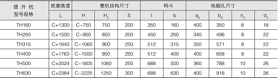 注:1、表中斗容是計(jì)算斗容(料斗盛水時(shí)的容積),輸送量是按填充系數(shù)為1時(shí)計(jì)算所得,實(shí)際應(yīng)用時(shí)要考慮填充系數(shù)。2、表中改進(jìn)型只有TH315、TH400、TH500、TH630。